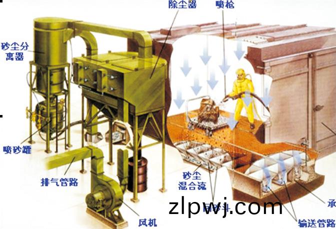 吸(xi)砂(sha)型噴(pen)丸(wan)房:本(ben)噴砂(sha)係(xi)統(tong)由噴砂房體(ti)、吸砂風機、吸砂(sha)除塵(chen)器、砂塵分(fen)離器、蜂窩式吸(xi)砂(sha)地(di)闆、噴丸(wan)缸主機、吸塵(chen)風(feng)機、吸(xi)塵除塵器、電控(kong)係(xi)統等部(bu)分組(zu)成(cheng)。